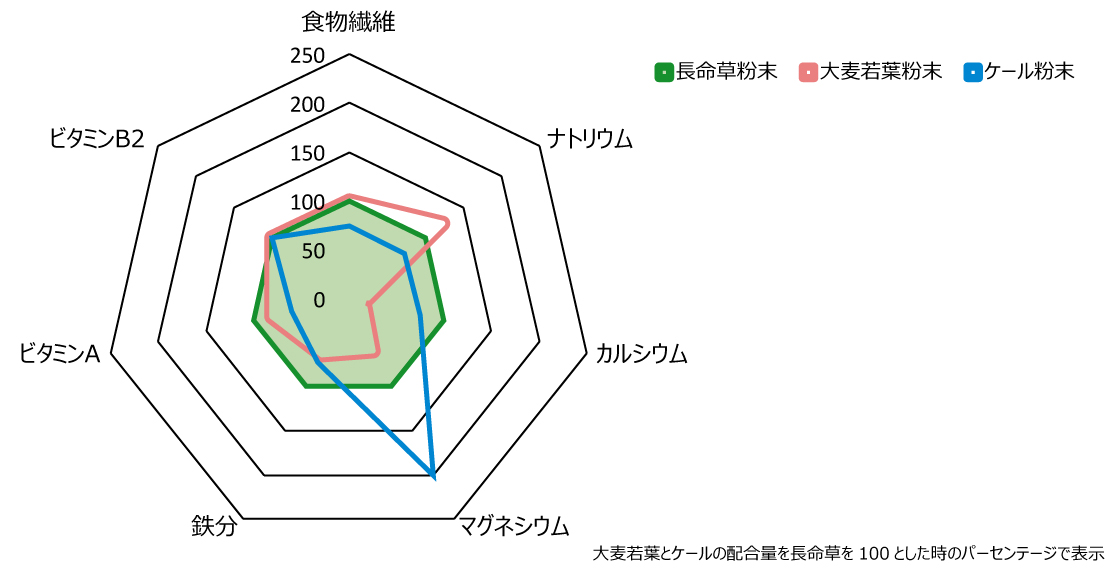 与那国島産の長命草は、ビタミン、ミネラル、食物繊維など、美容成分をバランスよく含有しています。青汁によく使われる素材と比較しても、そのバランスのよさは一目瞭然。![]()