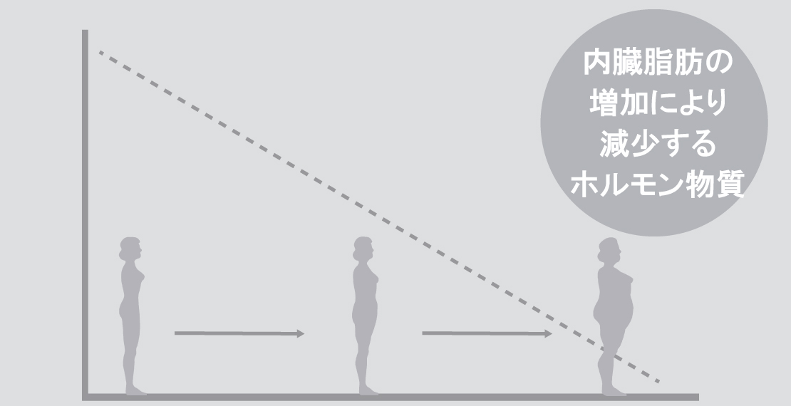 アディポネクチンは脂肪細胞から分泌されているため、脂肪が多く太った人のほうがたくさん分泌されるのでは と考えるかもしれませんが、事実はその逆です。内臓脂肪が多くなればなるほど、アディポネクチンの分泌量が減ってしまうことがわかっています。